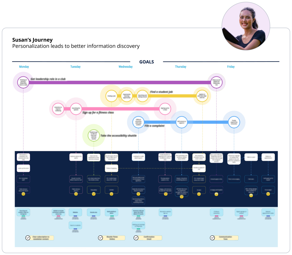 The project began with a comprehensive environmental scan and in-depth audience research, encompassing conversations with students and key service providers offering health, career, and financial aid. These interviews led to the development of detailed student personas, providing insights into the diverse user groups. Additionally, we created an ecosystem map of students' communication channels, clearly visualizing how information flows within the higher education environment.
