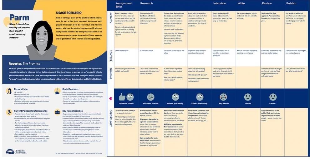 Two half-day workshops were held with stakeholders for news.gov.bc.ca and The Hub. During the workshop, stakeholders collaborated to draw up an assessment of the service design for the communications platforms through the lens of the personas, each of which had a key usage scenario.
